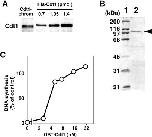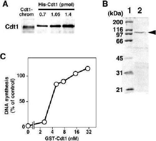 Figure 3. Cdc6-depleted chromatin associated with an amount of Cdt1 sufficient for RLF-B activity. (A) Sperm nuclei (80 000 nuclei) were incubated in 16 μl of Cdc6-depleted extract for 20 min and chromatin was isolated. Cdt1 on the isolated chromatin (ΔCdc6-chromatin) was detected by immunoblotting using anti-Xenopus Cdt1 antibody together with 0.7, 1.05 and 1.4 pmol of His-Cdt1. (B) GS T-Cdt1 was electrophoresed and stained with Coomassie Brilliant Blue R-250. A molecular weight marker (lane 1) and 1.2 μg of GST-Cdt1 (lane 2) were applied to a SDS–10% polyacrylamide gel for electrophoresis. An arrowhead indicates the migrated position of GST-Cdt1. (C) Licensing activity was assayed with a Cdt1-depl eted extract supplemented with GST-Cdt1. Sperm nuclei (10 000 nuclei) were incubated for 20 min at 23°C with 2 μl of Cdt1-single depleted extract after a 2-fold dilution with 0.01% Triton X-100 and 50 mM KCl in LFB2 containing increasing amounts of GST-Cdt1. The extent of the licensing reaction during the incubation was measured as the amount of DNA synthesized in a 3 h incubation with a geminin-containing extract supplemented with [α-32P]dATP (20 kBq). The amount of DNA synthesized is represented as a percentage of the radioactivity incorporated into DNA during the incubation in the geminin-containing extract to that in a geminin-free extract.