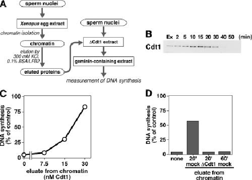 Figure 4. Cdt1 released from the licensed chromatin is active for the licensing. (A) The chromatin fraction was isolated after incubation of sperm nuclei (1 000 000 nuclei) with 200 μl of Xenopus egg extract for 20 min. Proteins bound on the chromatin were eluted by incubation of the isolated chromatin with a buffer containing 300 mM KCl and 0.1% BSA. Sperm nuclei (10 000 nuclei) were incubated for 20 min with 2 μl of Cdt1-single depleted extract after a 2-fold dilution with a buffer containing the elution fraction. After the incubation, the reaction mixture was further incubated for 90 min with 10 μl of a fresh egg extract supplemented with geminin (0.5 μM) and [α-32P]dATP (20 kBq). The extent of DNA synthesis is represented as a percentage of the radioactivity incorporated into DNA during the incubation in the geminin-containing extract to that in a geminin-free extract. (B) Xenopus sperm nuclei were incubated for indicated periods in the interphase extract. After the incubation, the chromatin fraction was isolated from the extract and subjected to SDS–10% polyacrylamide gel electrophoresis. Cdt1 in the chromatin fractions was detected by immunoblotting. Two microliters of the interphase extract was applied onto the lane indicated by ‘Ex’. (C) Proteins were eluted from chromatin after an incubation of sperm nuclei with egg extract for 20 min. Cdt1-single depleted extract was diluted 2-fold with a buffer containing the elution fraction corresponding to 0, 7.5, 15 or 30 nM Cdt1 and assayed for the licensing activity. (D) Proteins were eluted from chromatin after an incubation of sperm nuclei with egg extract for 20 or 60 min. Cdt1-depleted extract was diluted 2-fold with a buffer containing no eluate (none), an eluate from 20 min chromatin after a single depletion of Cdt1 (20' ΔCdt1) or after a mock treatment (20' mock), or an eluate from 60 min chromatin after mock treatment (60' mock).