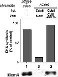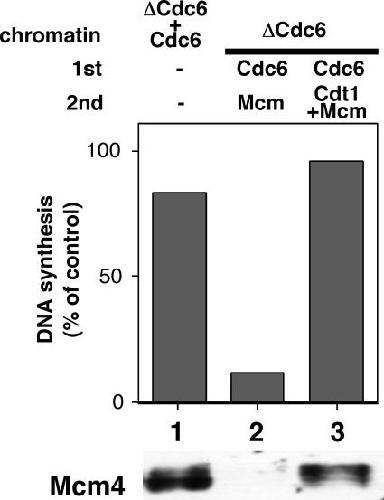 Figure 6. Cdc6 bound onto chromatin after Cdt1 functions in the licensing reaction. Sperm nuclei (200 000 nuclei) were incubated with 40 μl of Cdc6-depleted extract to isolate Cdc6-depleted chromatin. The Cdc6-depleted chromatin was incubated with the Cdc6 fraction for 20 min to allow the loading of Cdc6 onto the chromatin. The chromatin fraction was isolated and incubated with the Mcm fraction (column 2) or a mixture of the Mcm fraction and GST-Cdt1 (column 3) for 20 min. The chromatin isolated after the incubation with the Cdc6-depleted extract supplemented with Cdc6 (ΔCdc6 + Cdc6) was used as a control for licensed chromatin (column 1). A fresh egg extract (10 μl) supplemented with 0.5 μM of recombinant geminin and [α-32P]dATP (20 kBq) was added to the reaction mixture of the 2nd incubation and incubated for 3 h to assess the licensing activity. The extent of DNA synthesis is represented as a percentage of the radioactivity incorporated into DNA during the incubation in the geminin-containing extract to that in a geminin-free extract (upper panel). The chromatin fractions after the second incubation were isolated and subjected to immunoblotting to detect Mcm4 (lower panel).