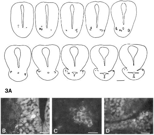 hypothalamus (e.g., the last section of the top row in A) form a coherent cell cluster. D, Caudally in the infundibulum (e.g., the last sections in the