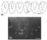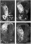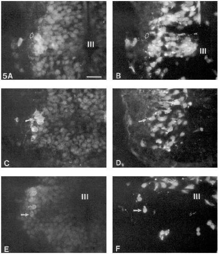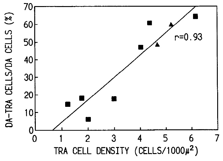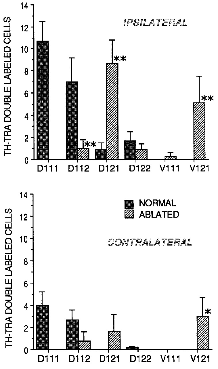 of members of the TRA-labeled clone, open circles indicate TH-positive cells, and dense-cored circles indicate double-labeled (DA-TRA) cells.