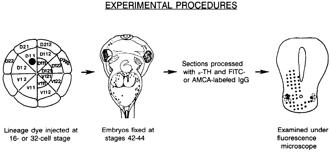 on the right of the cleavage stage embryo. Only those blastomeres that were injected in this experiment are labeled. The big solid circle represents