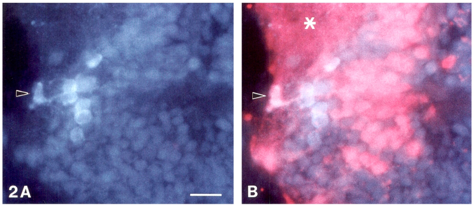 Figure 2. A pair of photomicrographs showing both TH immunofluorescence and TRA lineage dye. A, TH-positive neurons labeled with AMCA
