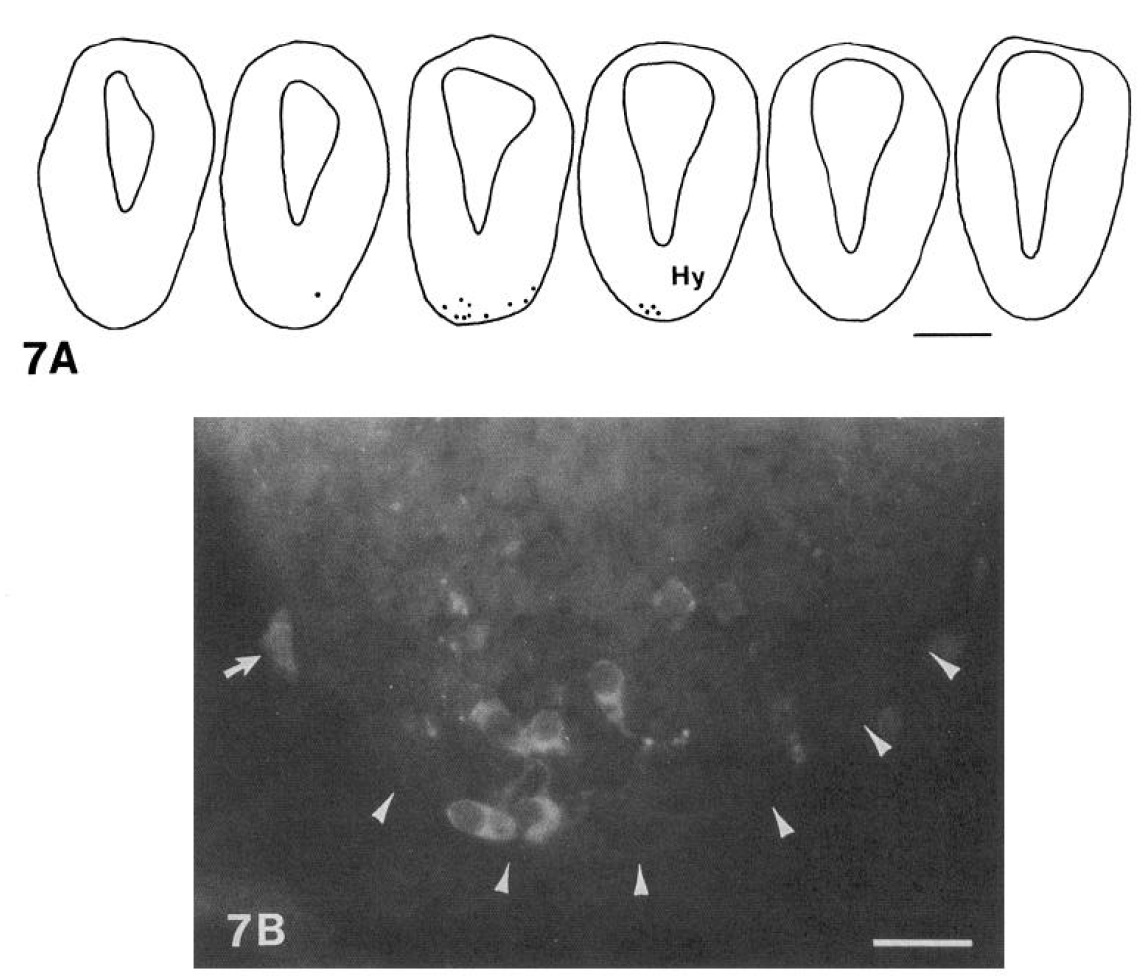 Figure 3. A, Camera lucida drawings of serial frontal sections showing the distribution of DA neurons (small open circles) in the hypothalamus