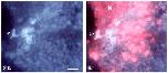 fluoresce blue under UV excitation. B, A double-exposed micrograph showing blue TH-positive cells and red cells that are members of a clone