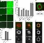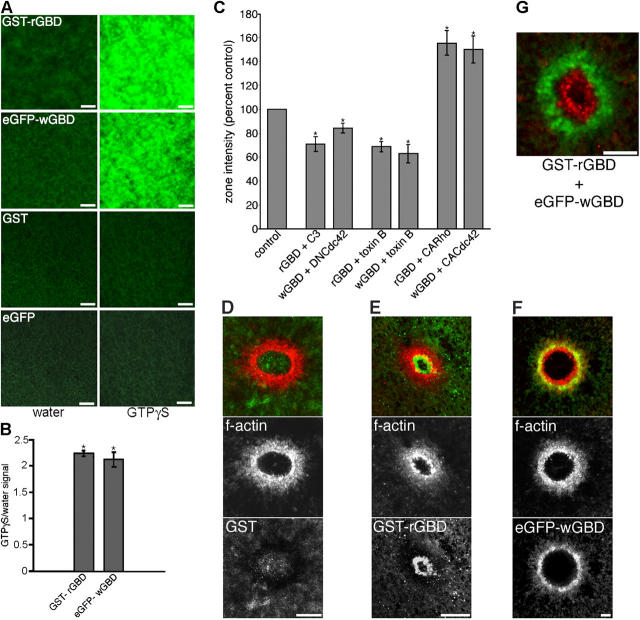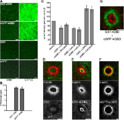 Figure 1. Endogenous and exogenous rho GTPase activity in resting and wounded oocytes. (A) Confocal images of plasma membrane (PM) fluorescence of oocytes injected with a GBD probe, GST, or eGFP, and subsequently injected with water or GTP-γ-S. Bars, 10 μm. (B) Quantification of PM fluorescence signal in oocytes containing the indicated probes and injected with water or GTP-γ-S (n = 30; results are shown as means ± SEM; asterisks indicate P < 0.001). (C) Quantification of background fluorescence intensity in resting oocytes containing the indicated probes and toxin B, C3 exotransferase (C3), or the specified construct, compared with controls containing the probes alone (n ≥ 3; results are shown as means ± SEM; asterisks indicate P < 0.001). (D) Confocal images show lack of GST (green) localization around a wound relative to F-actin array (red). Bar, 10 μm. (E) Confocal images show ringlike localization of GST-rGBD (green) on interior of F-actin array (red). Bar, 10 μm. (F) Confocal images show ringlike colocalization of eGFP-wGBD (green) with F-actin array (red). Bar, 10 μm. (G) Confocal image shows zone of GST-rGBD (red) encircled by that of eGFP-wGBD (green). Bar, 10 μm.