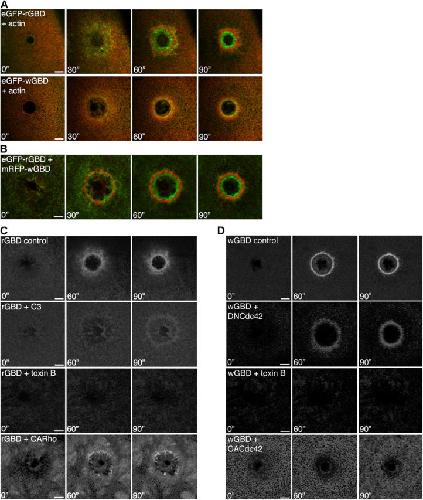 Figure 2. Rho GTPase activity zone dynamics. (A) Montage shows that zone of RhoA activity (eGFP-rGBD; green) appears as broad zone before focusing into a tight ring on actin array interior (red), whereas Cdc42 activity (eGFP-wGBD; green) appears and is maintained as a narrow zone in the middle of the actin array during wound healing (time in seconds; see Fig. S1). Bars, 15 μm. (B) Montage shows that RhoA (eGFP-rGBD; green) and Cdc42 (mRFP-wGBD; red) segregate into discrete zones during wound healing (time in seconds). Bar, 10 μm. (C) Montage shows that RhoA zone intensity (rGBD) is greatly reduced in the presence of C3 exotransferase (C3), toxin B, or constitutively active Rho (CARho), compared with control (time in seconds). Bars, 10 μm. (D) Montage shows that Cdc42 zone intensity of activity (wGBD) is greatly reduced in the presence of dominant negative Cdc42 (DNCdc42), toxin B, or constitutively active Cdc42 (CACdc42), compared with control (time in seconds). Bars, 10 μm. Videos available at http://www.jcb.org/cgi/content/full/jcb.200411109/DC1.