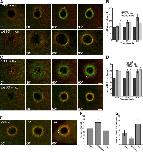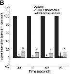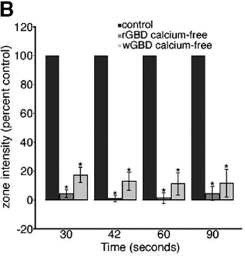 Figure 3. External calcium is required for local activation of RhoA and Cdc42. (A) Montage shows suppression of RhoA (eGFP-rGBD) and Cdc42 (mRFP-wGBD) activity zones at 90 s after wounding in calcium-free medium. Bars, 10 μm. (B) Quantification of GBD zone fluorescence intensity in the absence of external calcium, relative to controls, over time (n = 11; results are shown as means ± SEM; asterisks indicate P < 0.001).