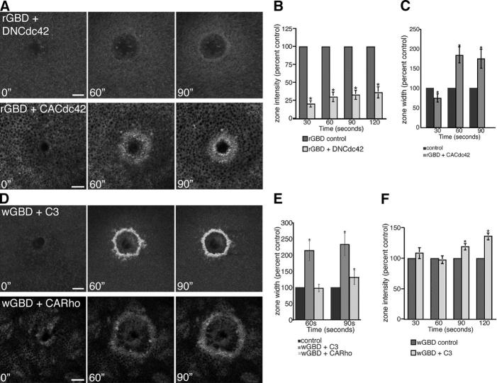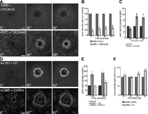 Figure 6. Crosstalk and rho GTPase zones. (A) Montage shows a decrease in RhoA activity zone intensity (rGBD) in the presence of DNCdc42 and an increase in zone width in the presence of CACdc42 (time in seconds). Bars, 10 μm. (B) Quantification of rGBD zone fluorescence intensity over time in the presence of DNCdc42 relative to controls (n = 8; results are shown as means ± SEM; asterisks indicate P < 0.05). (C) Quantification of rGBD zone width over time in the presence of CACdc42, relative to controls (n = 11; results are shown as means ± SEM; asterisks indicate P < 0.05). (D) Montage shows an increase in Cdc42 activity zone intensity (wGBD) in the presence of C3 and an increase in zone width with both C3 and CARho (time in seconds). Bars, 10 μm. (E) Quantification of wGBD zone signal width over time in the presence of C3 or CARho, relative to controls (n ≥ 4; results are shown as means ± SEM; asterisks indicate P < 0.05). (F) Quantification of wGBD zone fluorescence intensity over time in the presence of C3, relative to controls (n = 8; results are shown as means ± SEM; asterisks indicate P < 0.05).
