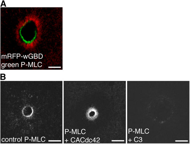 Figure 7. Activity zones and myosin-2 light chain phosphorylation. (A) Confocal image shows phosphorylated myosin-2 regulatory light chain staining (P-MLC; green) circumscribed by Cdc42 activity (red) in a fixed cell. Bar, 25 μm. (B) Confocal images of fixed cells show that P-MLC staining is broadened in cells treated with CACdc42 and reduced with C3, compared with control, at 3 min after wounding. Bars, 25 μm.
