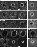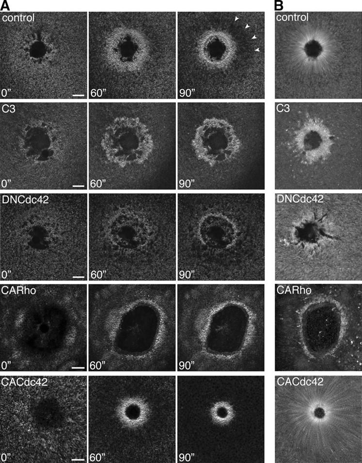 Figure 8. Contributions of rho GTPases to actin assembly and closure. (A) Montage shows varied appearance and dynamics of actin in cells treated with either C3, DNCdc42, CARho, or CACdc42, compared with control (arrowheads indicate the outer edge of the dark halo in control). Bars, 15 μm. (B) Montage of brightest point projections made from movies (available at http://www.jcb.org/cgi/content/full/jcb.200411109/DC1) shows that movement of individual actin filament clusters around wounds is greatly reduced in cells treated with C3, DNCdc42, or CARho, but increased with CACdc42, compared with control. Videos available at http://www.jcb.org/cgi/content/full/jcb.200411109/DC1.