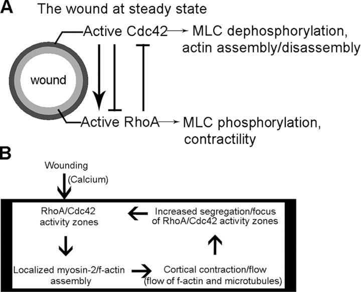 Figure 9. Summary, crosstalk, and working model for observed discrete localization of rho GTPase activity zones during wound healing. (A) Schematic shows observed concentric subcellular compartmentalization of RhoA and Cdc42 activity zones at wound border, summary of crosstalk, and their respective effects on actin dynamics. (B) Diagram shows working model for maintenance of wound-induced response. Upon wounding, a cytoplasmic activity module (inside box) is established in which activation of localized RhoA and Cdc42 leads to directed cortical contraction and flow, which cause accumulation of both actin and microtubules, which, in turn, further promotes zones of activity.