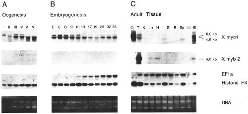 Fig. 4. RNA profiles for Xmybl and Xmyb2 in Xenopus development. (A) Oogenesis. Four cell equivalents of total RNA from stages of