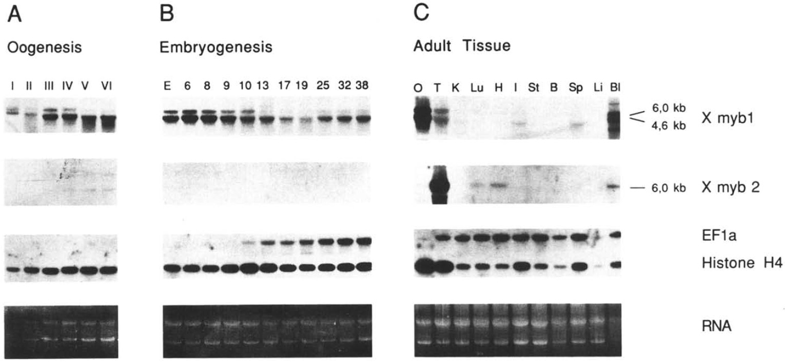 oogenesis indicated (Dumont, 1972) were loaded per lane and probed for Xenopus myb related transcripts with Xmybl and Xmyb2 eDNA