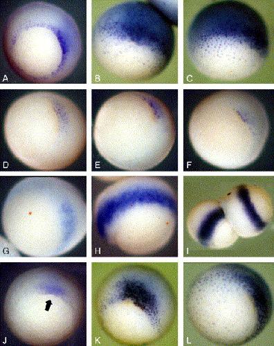 Fig. 3. SOX7 induces the endodermal marker endodermin. Fertilized eggs were injected with RNA encoding SOX7-GFP (B and C), allowed to develop to stage 11, and were then stained for Edd RNA. Compared to uninjected embryos (A), the extent and intensity of Edd staining was greatly increased in SOX7-GFP RNA-injected embryos. We compared the effects of injecting embryos with RNAs encoding VegT-EnR (D and G), Mixer-EnR (E and H), and SOX7δC-EnR-myc (F and I). All three EnR-repressor chimeras produce a similar decrease in the level and extent of Edd expression (DâF). In contrast, while VegT-EnR suppressed Xbra expression (G), both Mixer-EnR (H) and SOX7δC-EnR-myc (I) appeared to increase the level of Xbra expression; this increase was confirmed by QPCR (data not shown). When SOX7-GFP and VegT-EnR RNAs were injected together, the level and extent of Edd expression (K and L) was increased compared to the level observed in control (A) or VegT-EnR RNA injected embryos (D and J).