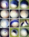 Fig. 2. Localization of SOX7 RNA. In situ hybridization of longitudinally bisected blastula stage embryos reveals the animal hemisphere concentration of SOX3 (A) RNA, while SOX17 RNA is localized to the vegetal region (B). While staining for SOX7 RNA was consistently quite weak, it was clearly restricted to the vegetal hemisphere (C). Embryos at stage 8 were dissected into animal caps (AC) and vegetal masses (VM) (indicated by white line in part A) and then analyzed for SOX7 or SOX11 mRNA by RT-PCR (D) either immediately (st8) or after they had been cultured until control embryos reached stage 16 (st16). Primers for ornithine decarboxylase (ODC) were used as a control for cDNA quality; the absence of reverse transcriptase (-RT) was used to control for the presence of contaminating DNA. At both time points, SOX7 mRNA was restricted to the vegetal mass; under similar conditions, SOX11 mRNA was restricted to the animal hemisphere. (E) A second set of SOX7-specific primers (Table 1 âSOX7 codingâ) was used to confirm the vegetal localization of SOX7 RNA. Animal caps and vegetal masses were prepared at stage 8 and analyzed either immediately (â1â), after 2 h (â2â), or when control embryos had reached stage 27 (â3â); these primers amplified a fragment of the expected size (1kb) that was again restricted to the vegetal mass.