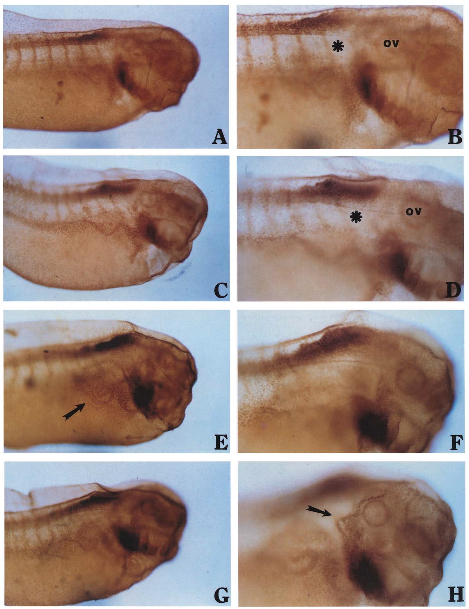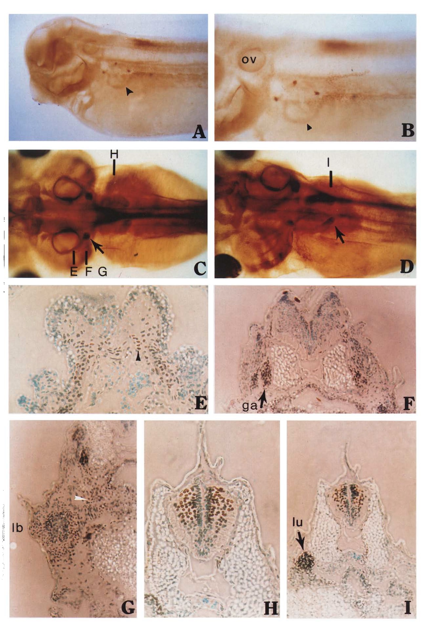 antibody. Notice strong labelling in the IX-X ganglia (arrow) and in the caudal hindbrain. The branchial arches are also stained (E, F, G) and