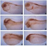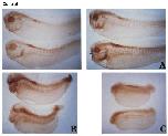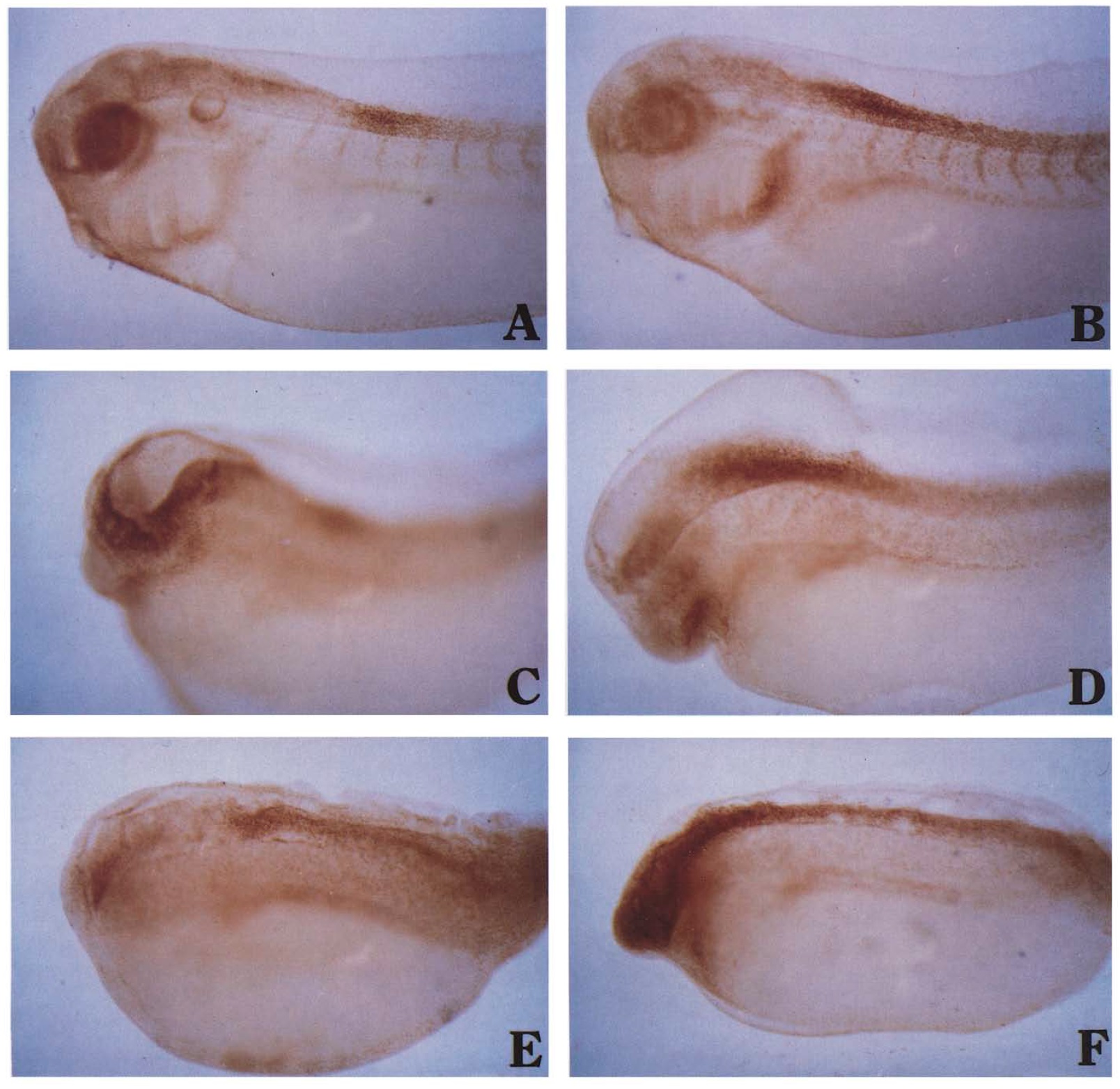 Fig. 2. Stage 37 embryos treated with RA at stage 11 and stained with Xebl (left figures) and Xeb2 (right figures) antibodies. (A, B) control