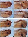 Fig. 1. Inmunolocalization of Xebl and Xeb2 protein in untreated Xenopus laevis embryos. (A) Stage 30 embryo, showing Xebl protein