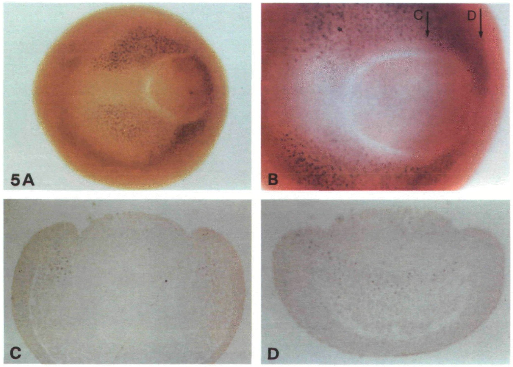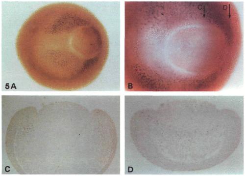 Fig. 5. XMyoD expression in gastrulae. (A) st 11.5 wholemount, showing collar of stained nuclei around the blastopore; (B) higher power view of the area surrounding the yolk plug of a stll embryo, focused to show the gap in dorsal staining, which corresponds to the prospective notochord; (C, D) slightly oblique sections of stll wholemount, cut in approximately the planes indicated in (B). Some of the yolk plug nuclei are faintly stained in (D), a non-specific consequence of rather heavy staining, that we have seen also with other primary antibodies.