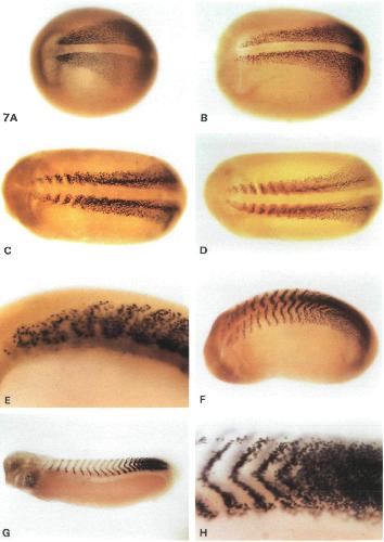 Fig. 7. Expression of XMyoD in neurulae and tailbud embryos. Whole-mount immunocytochemistry with D7F2. (A) Early neurula (st12.5-13); (B) mid-late neurula (st17); (C-E) late neurulae (stl9), (D) same embryo as in C also stained with 12/101 (red), (E) side view of newly formed somites; (F) early tailbud (st24); (G, H) later tailbud (st27), (H) close-up of developing tail where myotomes are forming, the major site of XMyoD expression at this stage. Note that XMyoD and 12/101 staining in D can be distinguished on the basis of subcellular location, even if the secondary antibodies used to detect 12/101 react with any unremoved D7F2. Some staining of the archenteron contents is visible in F, which we judge to be a result of non-specific sticking of the antibodies, because we have seen it also with several other monoclonal antibodies and when no primary antibody was used, but not when all antibodies were omitted. Colour reactions were allowed to proceed so as to give the highest signal over background, that is for longer for the early neurula and tailbud embryos, than for the more strongly expressing late neurulae. Anterior of all embryos to the left.