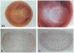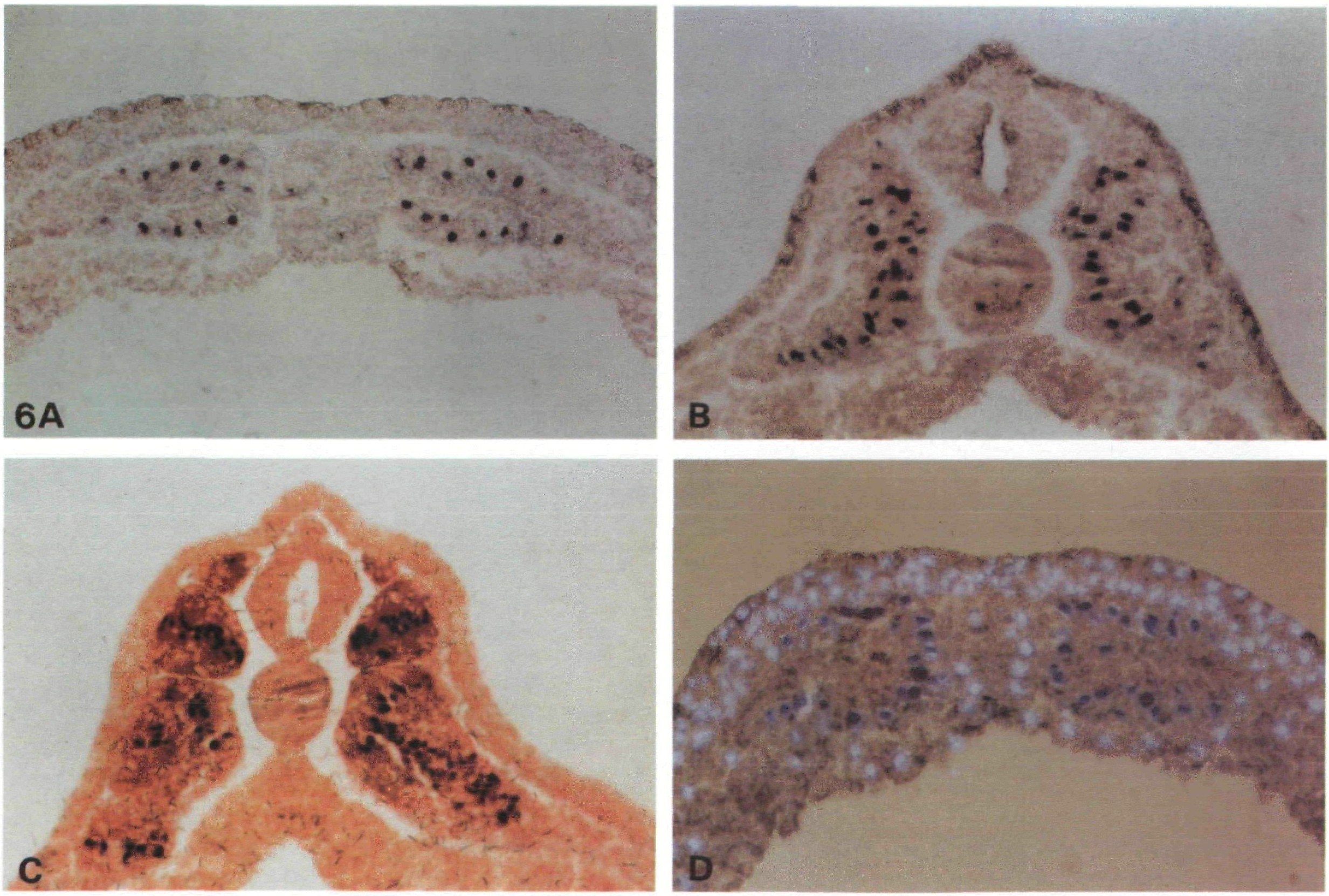 Fig. 6. XMyoD is present only in myotomal nuclei of neurulae and tailbud embryos. Transverse sections of (A) an early neurula (st12.5-13), and (B) an early tailbudembryo (st23) stained with D7F2. (C) Section through the posterior part of the segmented region of a tailbudembryo (st26) stained for XMyoD (blue-purple) and 12/101 antigen (red), showing that all XMyoD-expressing nuclei are in 12/101-positive cells. (D) Section through mid-neurula (stl5-16) stained with D7F2 for XMyoD and with Hoechst 33258 to show all nuclei. XMyoD non-expressing nuclei show the bright, light blue Hoechst fluorescence; XMyoD expressing nuclei show a darker blue due to Hoechst fluorescence shining through the dark BCIP/NBT blue purple reaction product. All clearly myotomal nuclei express XMyoD.