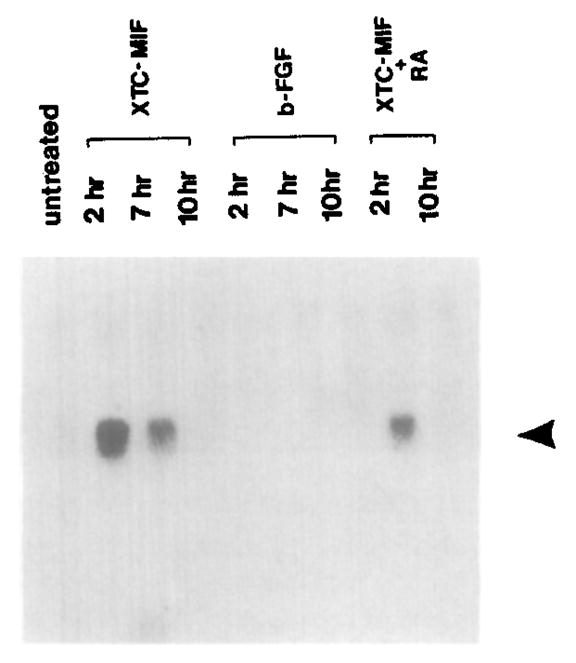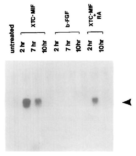 Note that goosecoid mRNA (arrowhead) is induced transiently by XTC-MIF (activin), that it is not induced at all by bFGF, and that XTC-MIF induction is inhibited by RA (compare lanes incubated with growth factor for 2 hr). XTC-MIF was used at 1:3 dilution. FGF was used at 200 ng/ml and RA at 10−6 M. Total RNA extracted from 20 animal caps was loaded in each lane and processed as described (Blumberg et al., 1991).