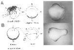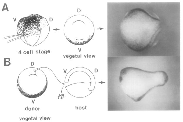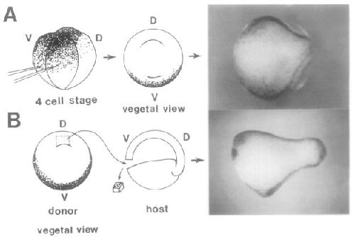 Experimental diagram and embryos resulting from (A) microinjection of goosecoid mRNA into the two ventral blastomeres (as close as possible to the first cleavage plane) and (B) a traditional Spemann organizer transplantation experiment. Note that the resulting embryos resemble each other and have extensive secondary neural tubes (dark lines) at the late neurula stage. In both embryos the two axes originate independently from each other in the posterior region, i.e., two sites of dorsal invagination were present during gastrulation.