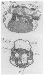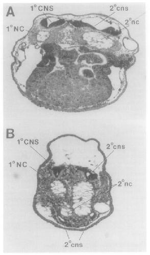 Two transverse sections from the same animal are shown. Note that the notochord is much larger in the secondary axis (2°nc) than in the primary axis (1 °NC). Note that in more posterior regions (B), two small additional neural tubes (cns) have formed in close proximity to the ectopic notochordal tissue in the ventral side of the embryo.