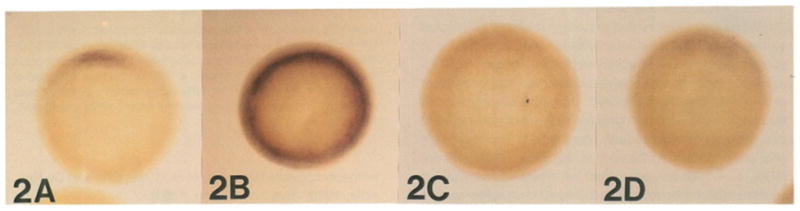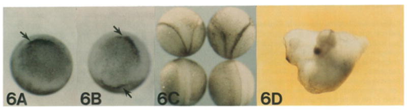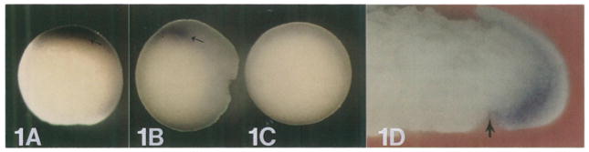 (A) antisense probe, vegetal view; (B) antisense probe, side view; (C) control sense probe, vegetal view; (D) sagittal section through the dorsal lip. Note that goosecoid hybridization is located in the deep layer of the upper lip of the blastopore. The fate of this region is to become head and notochordmesoderm. The arrow indicates the dorsal blastopore lip.