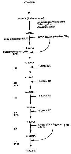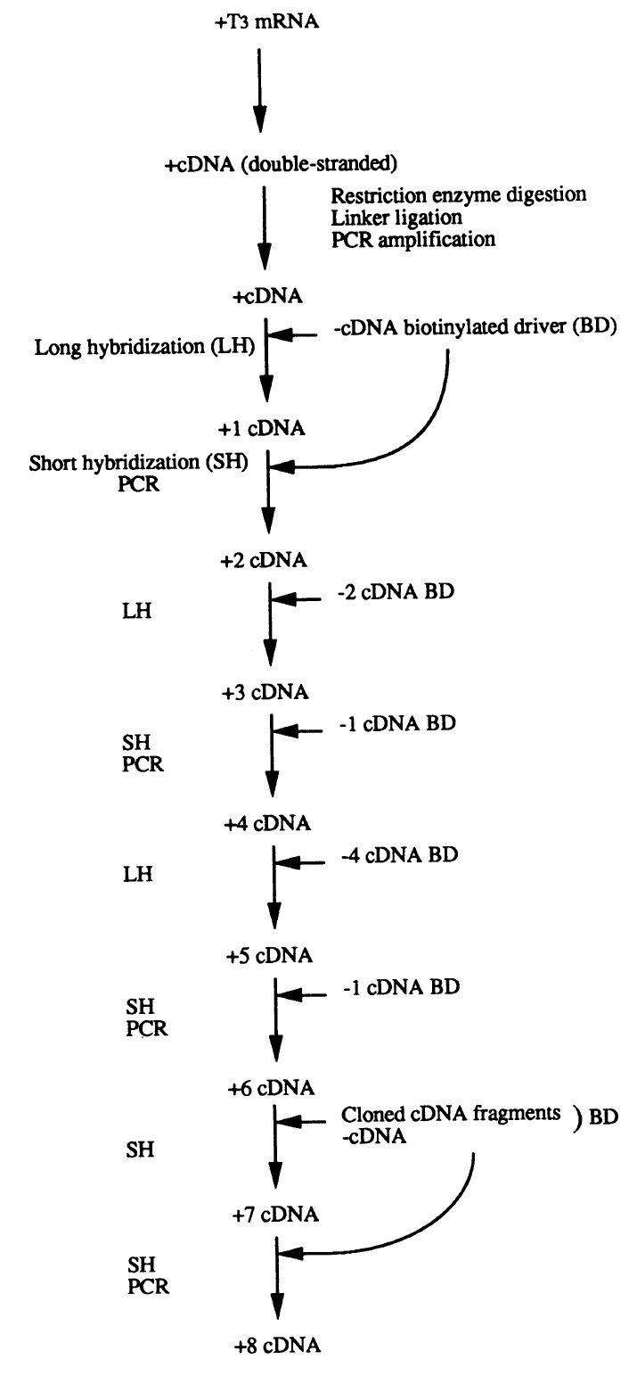 FIG. 1. Flow diagram for isolation of up-regulated genes. A plus