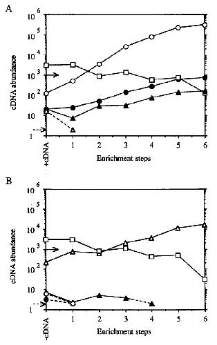 genes (B), using - cDNA as tracer and + cDNA as driver. The