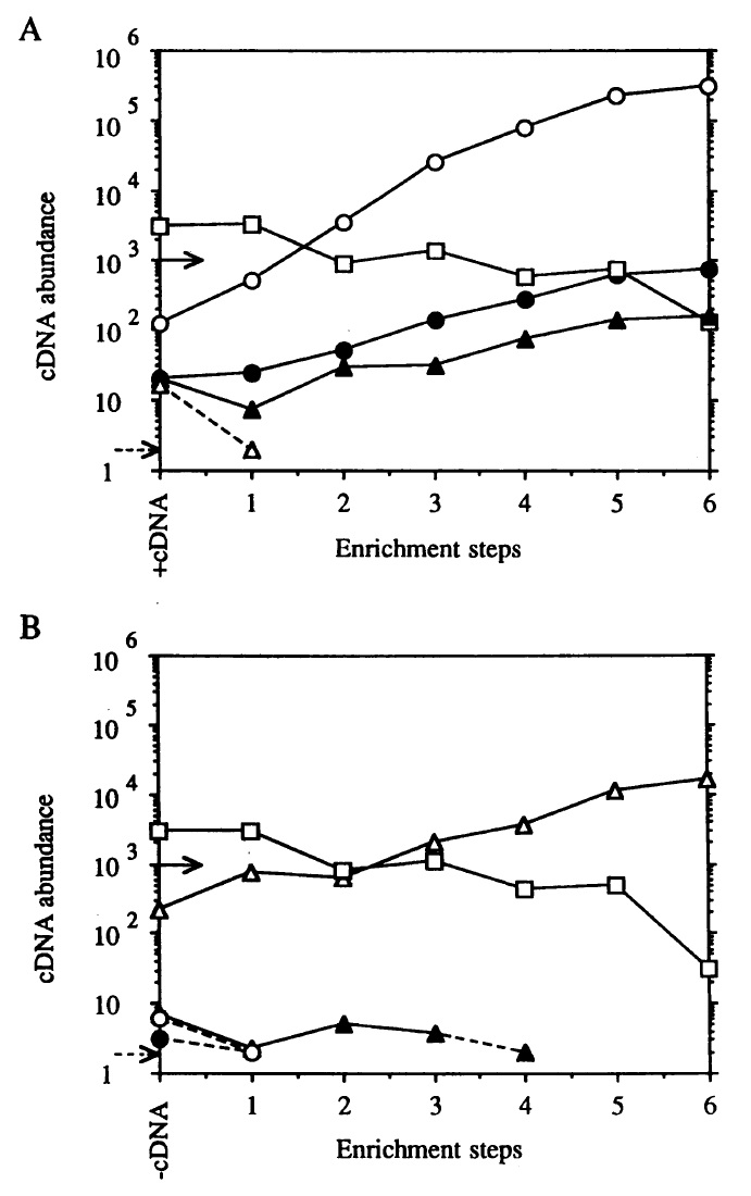 every 500,000 cDNA molecules at each step of enrichment. Upper