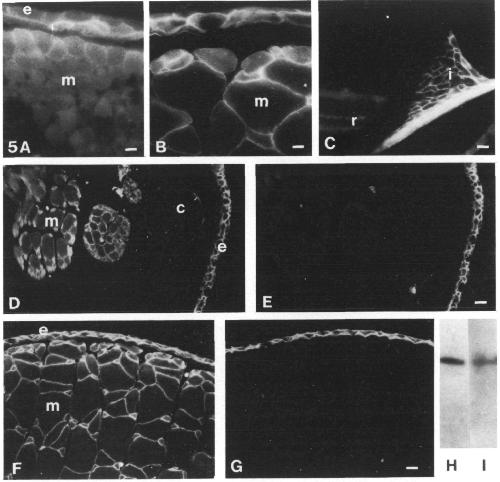 epidermis (I) with R-8327 corresponding to specimens shown in F. c, cartilage; e, epidermis; i, iris; m, muscles; r, retina.