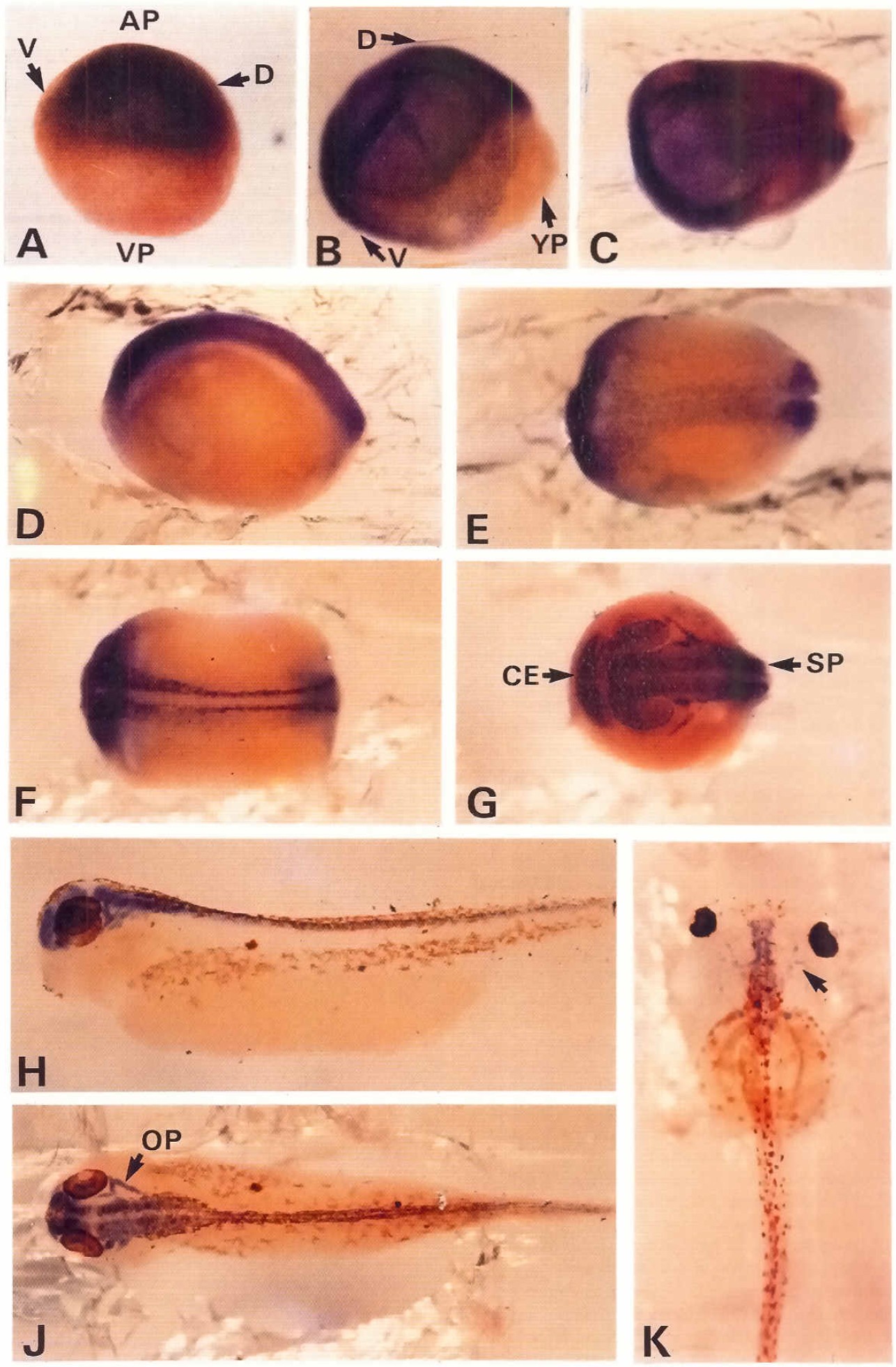 The signal can be identified on the dorsal side (O) and also in the ventral (V, presumptive epidermis) and lateral parts (YP yolk plug). (C) Late gastrula (stage