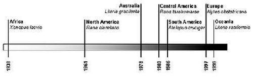 Figure 3. Time bar indicating when chytridiomycosis first appeared in the major centers of occurrence in relation to each other. Following a 23-year interruption in occurrences after the Xenopus laevis infection in 1938, records outside Africa appear with increasing frequency up until the present; North America (22), Australia (2,23), South America (5), Central America (24), Europe (6), Oceania (New Zealand) (25).
