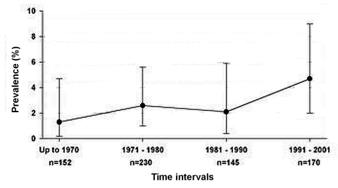 Figure 2. Historical time-trend of chytridiomycosis prevalence in southern Africa. No significant change was shown in the prevalence over time (p = 0.22, 95% confidence interval).
