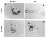 (D) are longitudinal sections. Note two notochords and four eyes in (C). but only one notochord contains the lineage tracer. Abbreviations are as