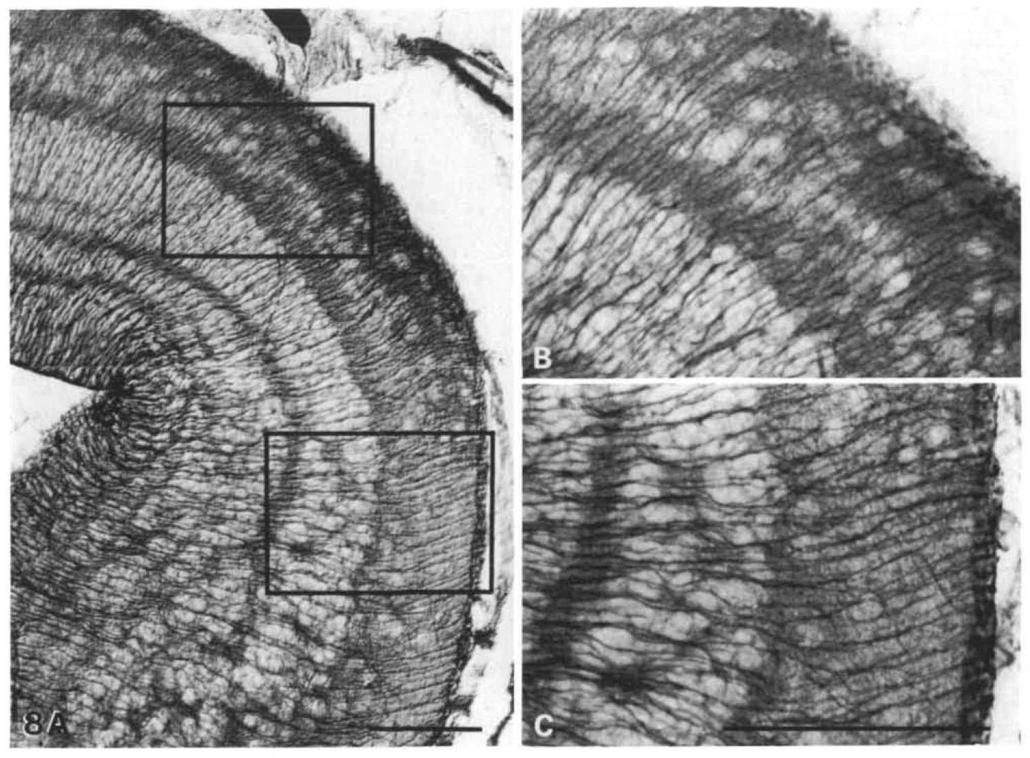 Fig. 8. (A) Anti-GFAP staining of frozen section of tadpoletectum. This antibody (clone G-A-5) only stains radial glial