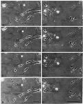 Nasal and temporal retinal neurites were confronted in culture with glial cells from the rostral and caudal parts of the optic tectum and with glial cells from the diencephalon. Twenty of each of the six classes of encounter between individual growth cones and isolated glial cells were analysed by time-lapse videorecording. The results show that growth cones from the temporal retina collapse when they contact glial cells from the caudal tectum, but do not collapse when they contact glia from other areas. Growth cones of nasal retinal fibres do not collapse on contact with any of the glial types examined. This suggests that the inhibitory phenomena described by others are in part due to the cell surface characteristics of glial cells, and that there are differences between glia from the front and back of the optic tectum.