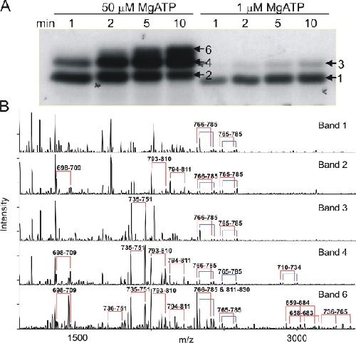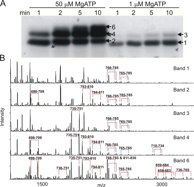 Figure 2. . Order of in vitro PKA phosphorylation of R-domain peptide determined by SDS-PAGE and mass spectrometry. (A) R-domain protein was incubated with 50 μM or 1 μM γ32P-MgATP. Samples were separated by SDS-PAGE and exposed to X-ray film. The gel bands indicated (numbered arrows) were excised (Band 6 was excised from the upper part of the top-most band in the 10-min lane at 50 μM MgATP, as indicated by the arrow), digested by trypsin, and the resulting proteolytic products subjected to mass spectrometric analysis. (B) MALDI-ion trap mass spectrometric analysis of the five bands indicated in A showing that serine 768 is the most readily phosphorylated residue. Pairs of peaks separated by 98 D (joined by the red and blue connecting lines) provide signatures for phosphorylated peptides (see text). The blue lines designate peptide that is singly oxidized at methionine 773 (or 721, Band 4); the red lines indicate the corresponding unoxidized peptides. The amino acid residues of these phosphopeptides are indicated above each pair of peaks. For example, 766–785 and 765–785 correspond to two alternative cleavage products of the trypsin digestion. Because the masses of phosphorylated peptides 811–830 and 766–785 are respectively 2411.110 and 2411.164 (Table I), these two species were not resolved in this experiment, but the presence of 811–830 was inferred from the change in ratio of the pair of peaks associated with this mass in Band 6 (bottom panel) compared with other bands, which contain only 766–785. The peptide 766–785 contains a single methionine, which was partially oxidized to give the two pairs of peaks seen in all five panels. As peptide 811–830 contains no methionine residue, the presence of peptide 811–830 together with peptide 766–785 is signaled by a change in the ratio of the pairs of peaks 16 D apart.