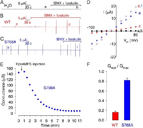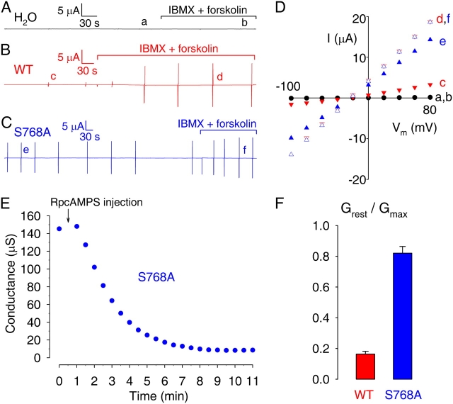 Figure 3. . Membrane conductance of resting and activated oocytes expressing WT or mutant S768A CFTR. Current time courses, recorded under two-microelectrode voltage clamp, of oocytes injected with water (A), or with cRNA encoding (B) WT or (C) S768A CFTR. Membrane potential was held near the resting potential (between −40 and −20 mV). Membrane conductance was monitored at regular intervals using brief voltage steps (vertical lines); complete current/voltage (I/V) relationships were determined under resting conditions (time points a, c, e), and after activation of cellular PKA with 50 μM forskolin + 1 mM IBMX (time points b, d, f). (D) Representative I/V plots under conditions as indicated in A–C, showing steady currents measured by averaging current samples toward the ends of 75-ms steps to voltages between −100 and +80 mV. (E) Rapid reduction of resting conductance (from 145 to 8 μS) upon injection of RpcAMPS into an oocyte expressing S768A CFTR. (F) Ratios, for WT- and S768A-expressing oocytes, of membrane conductances at rest (Grest), and after maximal activation of CFTR (Gmax); conductance values were similar for oocytes injected with 2.5 or 5 ng of each cRNA, so pooled results are shown.
