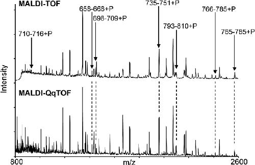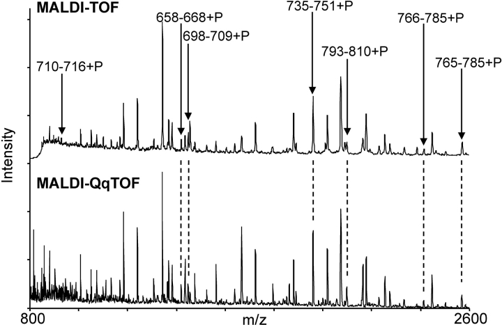 Figure 4. . Serine 768 of WT CFTR is significantly phosphorylated in vivo in resting oocytes. MALDI-TOF (top) and MALDI-QqTOF (bottom) mass spectra of peptides obtained by trypsin digestion of WT CFTR immunoprecipitated from the membranes of resting oocytes that were lysed in the presence of phosphatase inhibitors to preserve phosphoserines present at that instant. Arrows identify phosphorylated (+P) peptides (molecular masses are listed in Table I).