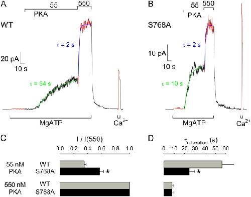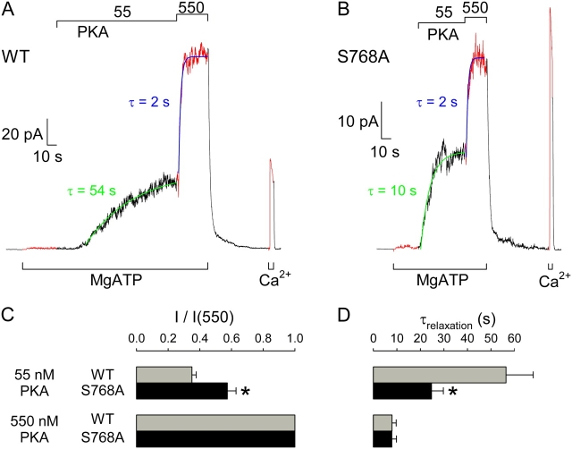 Figure 5. . Activation in excised patches of macroscopic WT and S768A CFTR currents by low and high concentrations of PKA catalytic subunit. (A and B) Currents recorded in patches containing hundreds of WT (A) or S768A (B) CFTR channels. No substantial current is activated in either case by 2 mM MgATP applied ∼2 min after patch excision, but 55 nM, and 550 nM, PKA catalytic subunit activate increasing amounts of current in both cases. Solid green and blue lines show single-exponential fits to the current time courses, with indicated time constants; activation/inactivation time course of endogenous Ca2+-activated Cl− channel current elicited by a brief pulse of 2 mM Ca2+ was used to estimate the speed of solution exchange. (C) Fractional current activated by 55 nM PKA was significantly smaller for WT (gray bar) than S768A (black bar; *, P = 0.0024) CFTR channels; mean steady current in 55 nM PKA was divided by mean steady current in the same patch at 550 nM PKA. (D) Time constants of macroscopic current relaxations upon addition of 55 nM (top) or 550 nM (bottom) PKA, for WT (gray bars) and S768A (black bars) CFTR; activation was faster for S768A at low (*, P = 0.036), but not at high [PKA].