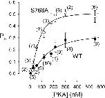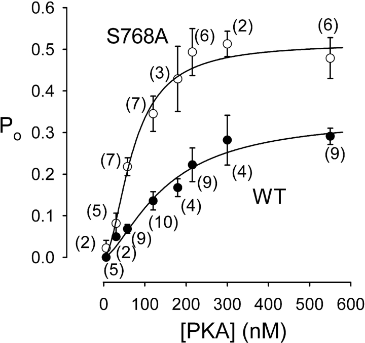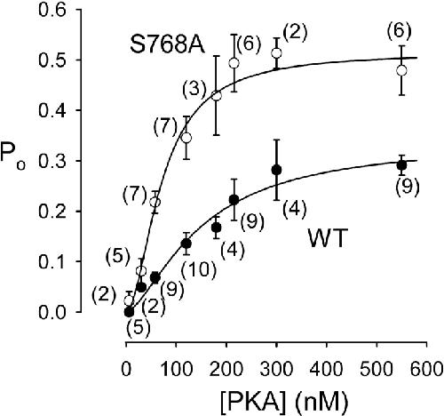 Figure 7. . Dependence on [PKA] of open probability, Po, of WT (•) and S768A (○) CFTR channels. Steady-state mean Po measured in (n) excised patches, containing few channels, during exposure to 6–550 nM PKA plus near-saturating [MgATP] (1–2 mM), is plotted against [PKA]. Lines show nonlinear least-squares fits to the Hill equation, yielding Po,max = 0.34 ± 0.06, K0.5 = 149 ± 46 nM, nH = 1.5 ± 0.5 for WT, and Po,max = 0.51 ± 0.05, K0.5 = 71 ± 12 nM, nH = 1.8 ± 0.5 for S768A.