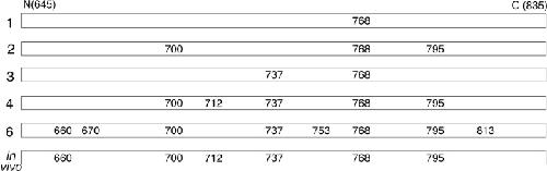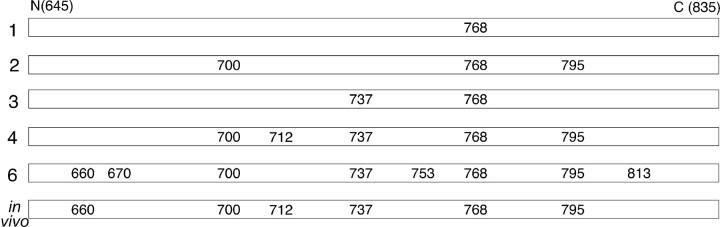 Figure 9. . Summary of R-domain serines found to be phosphorylated by mass spectrometric analysis of trypic digests of bands (1, 2, 3, 4, 6 as indicated) from SDS-PAGE gels after in vitro phosphorylation (data from Fig. 2) or of full-length WT CFTR isolated from resting oocytes (in vivo; data from Fig. 4). Ser 768 is the first site phosphorylated, and is found phosphorylated in oocytes at rest; the major mobility shift to band 3 is associated with phosphorylation of Ser 737.