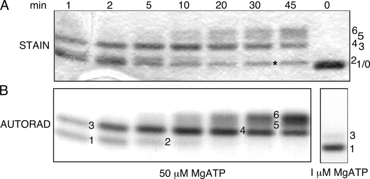 Figure 1. . Time course of in vitro phosphorylation of R-domain peptide by PKA revealed by SDS-PAGE. Incubations were with 50 μM γ32P-MgATP for various times as indicated (0–45 min), except for the sample shown in the lower right panel, which was incubated with 1 μM γ32P-MgATP for 2 min. Samples were separated by SDS-PAGE, gels stained with Coomassie blue (A, STAIN), dried, and exposed to X-ray film (B, AUTORAD). Numbers label bands of varying mobility (stain band labeled * is an impurity). The unphosphorylated R domain (sample at 0 min) migrates as a single species of ∼28 kD (band 0, upper panel, extreme right).