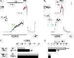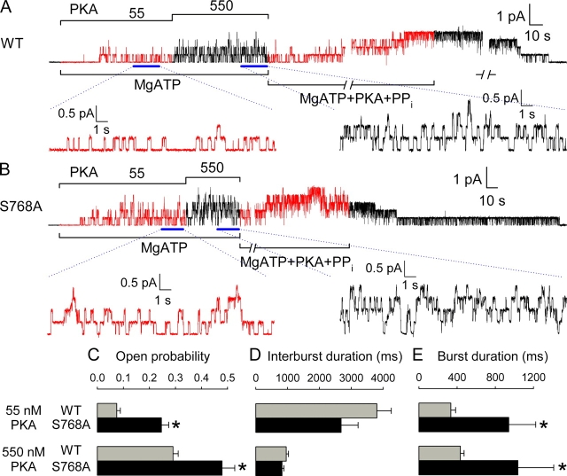 Figure 6. . Kinetic behavior of WT and S768A CFTR channels in excised patches exposed to low and high [PKA]. Representative baseline-subtracted current traces of (A) four WT and (B) five S768A channels, recorded from excised patches in the presence of 2 mM MgATP + 55 nM or 550 nM PKA; 20-s segments (indicated by bars) under each condition are shown with 10-fold expanded time scale, below. Channels were counted by locking them in the open-burst state with 0.1 mM MgATP + 2 mM pyrophosphate (PPi) + 300 nM PKA. (C–E) Open probabilities (C), mean interburst (D) and open burst (E) durations at 55 nM (top) or 550 nM PKA (bottom), for WT (gray bars) and S768A (black bars) CFTR channels; asterisks indicate significant differences between S768A and WT (0.001 < P < 0.06).