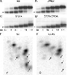 Figure 8. . (A–D) Time courses of in vitro phosphorylation of R-domain peptides with COOH-terminal His tags. WT (A) and mutant R-domain peptides, with Ser768 replaced by alanine (S768A; B), Ser737 replaced by alanine (S737A; C), or Ser737 and Ser768 both replaced by alanine (S737A-S768A; D), were phosphorylated with 10 nM PKA and 5 μM γ32P-MgATP for 0.5–60 min as indicated. Samples were subjected to SDS-PAGE and analyzed by autoradiography; the arrowheads indicate relative molecular mass of 28 kD. The major mobility shift (to band 3; Figs. 1 and 2) was seen in the WT and S768A peptides, but not in the S737A or S737A-S768A peptides. The kinetics of R-domain phosphorylation, as demonstrated by the mobility shifts, was little altered in the two S768A mutants. (E and F) Two-dimensional tryptic phosphopeptide maps of His-tagged WT and S768A R-domain peptides phosphorylated in vitro as in A and B, but for 0.5 min with 10 nM PKA and 50 μM γ32P-MgATP, and then subjected to SDS-PAGE and analyzed by autoradiography. The lower radioactive bands were excised, digested overnight with 50 μg/ml TPCK-trypsin, and the digests separated on thin layer cellulose plates by electrophoresis at pH 3.5 in the first dimension and ascending chromatography in the second dimension. O, 0rigin; left, positive; right, negative. Four spots (arrows) in the WT R domain map are absent from the S768A map, but no similarly striking differences are seen in the pattern or intensity of other spots.
