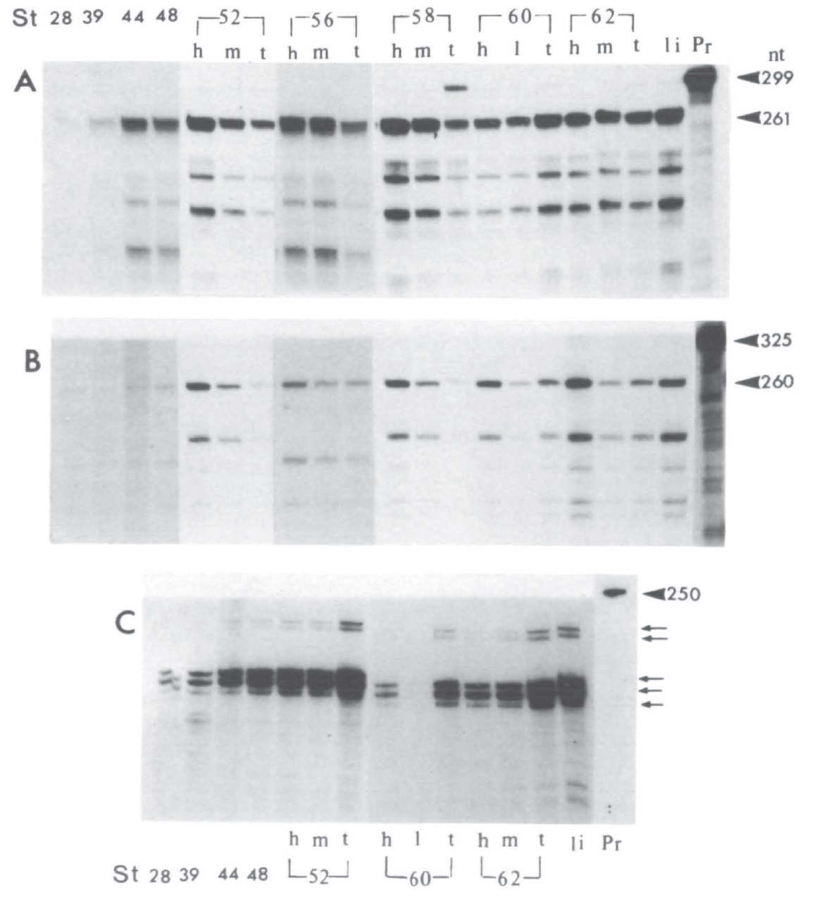 A characteristic feature of the obligatory control of amphibian metamorphosis by thyroid hormones is the early acquisition of response of tadpole tissues to these hormones well before the latter are secreted, with 'exponentially' increasing hormonal sensitivity upon the onset of metamorphosis. We have therefore analyzed the expression of the two thyroid hormone receptor genes (TR alpha and beta) before, during and after metamorphosis in Xenopus tadpoles and froglets. Using non-cross-hybridizing cRNA probes for 5' and 3' sequences of Xenopus TR alpha and beta transcripts for RNAase protection assays, the two mRNAs can be detected in tadpoles as early as stage 39. Their concentration increases abruptly at stage 44 and continues to increase differentially at the onset of metamorphosis (stage 55) and through metamorphic climax at stages 58-62, after which they decline upon completion of metamorphosis at stage 66. Quantitative densitometric scanning of autoradiograms showed that, although the concentration of TR beta transcripts is about 1/30th of that of TR alpha mRNA at stages 44-48, depending on the region, it accumulates 3-10 times more rapidly than does the alpha isoform during further development. A substantial proportion of the increase in TR beta mRNA is localized to the head region of tadpoles. Using the hormone-binding domain (HBD) and 3' end of Xenopus TR alpha cRNA as probe for in situ hybridization, the highest concentration of TR transcripts in stage 44 tadpoles is seen in the brain and spinal cord. High concentrations of mRNA are also present in the intestinal epithelium and tail tip, tissues programmed for regression. At later stages (55 onwards), strong hybridization signals are also exhibited by hindlimb buds. This pattern persists through metamorphic climax, after which TR mRNAs decline in all tissues to low levels in froglets at stage 66. In developing froglets, TR transcripts were detected in large amounts in the cytoplasm of stage 1 and 2 oocytes but the rate of their accumulation did not increase with further oocyte growth. This observation raises the possibility that the response to thyroid hormones at early stages of tadpoles (42-44) may be due to TR synthesized on maternally derived mRNA. Exposure of tadpoles at premetamorphic stages (48-52) to exogenous thyroid hormone (T3) substantially enhanced the accumulation of TR mRNA, especially that of TR beta message, which could explain the accelerated increase in sensitivity of tadpoles to thyroid hormones at the onset of natural metamorphosis.(ABSTRACT TRUNCATED AT 400 WORDS)